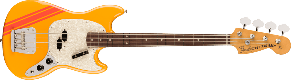 Fender 0149260339 Vintera II Competition Mustang Bass Electric Guitar Competition Orange Gig Bag: Body Material Alder Body Finish Gloss Polyester Body Shape Mustang® Bass Middle Pickup Vintage-Style '70s Split Single-Coil Mustang Bass® Controls Master Volume, Master Tone Switching None Configuration Split Single-Coil Bridge 4-Saddle Mustang® Bass Strings-Through-Body Hardware Finish Nickel/Chrome Tuning Machines Fender® '70s Vintage-Style Stamped Open-Gear Pickguard 4-Ply Aged White Pearloid Control Knobs Black Plastic Neck Plate 4-Bolt with "F" Logo Neck Material Maple Neck Construction 4-Bolt Standard Neck Finish Gloss Urethane Neck Shape Early '70s "C" Scale Length 30" (762 mm) Fingerboard Material Slab Rosewood Fingerboard Radius 7.25" (184.1 mm) Number of Frets 20 Fret Size Vintage Tall Nut Material Synthetic Bone Nut Width 1.625" (41.3 mm) Position Inlays White Dot Side Dots White Truss Rod Vintage-Style Butt Adjust Truss Rod Nut Vintage-Style Butt Adjust