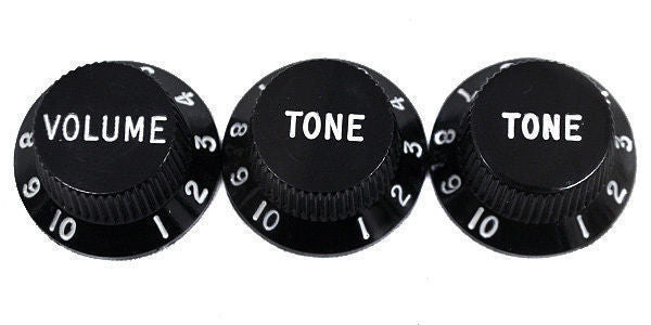 Fender 099-1365-000 Strat Guitar Knob Set of 3 Black: Genuine Fender Guitar Knobs- Black 1 Volume & 2 Tone Knobs Included Fits 1/4" split shaft controls Used on nearly all Strat models (US & Mexico) produced from 1954-present Made in the USA!