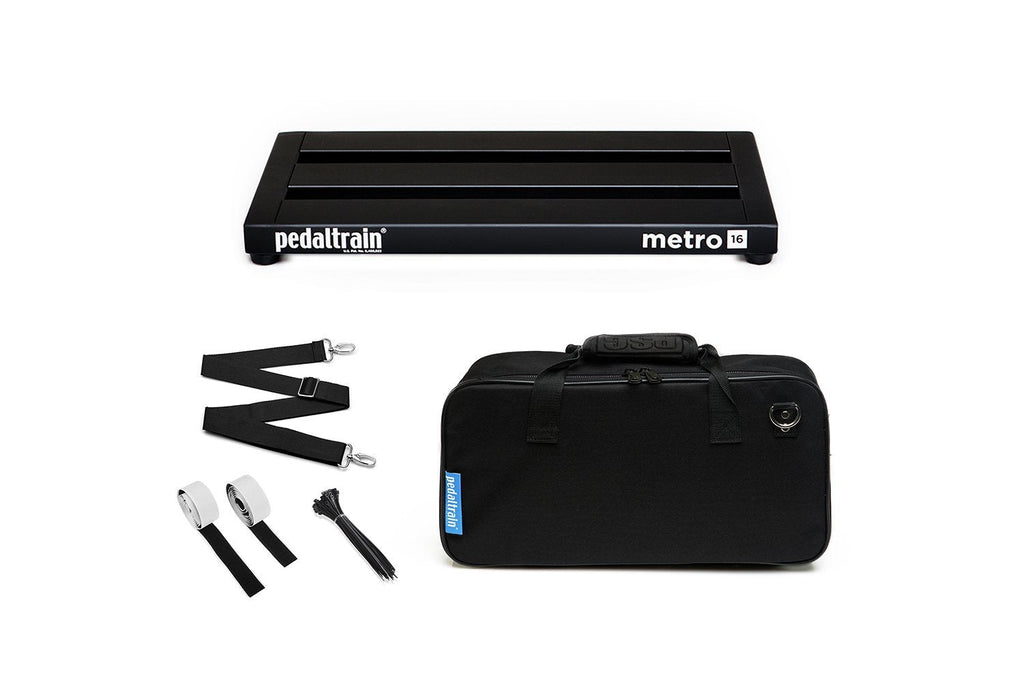 PedalTrain METRO 16 Guitar Effect Pedal with Soft Case: 16x8x1.4 inch hand-crafted pedal board Featherweight, aircraft grade aluminum Included with purchase is 48 inches (122 cm) of Pedaltrain’s professional grade adhesive backed hook-and-loop and plenty of zip ties for securing pedals